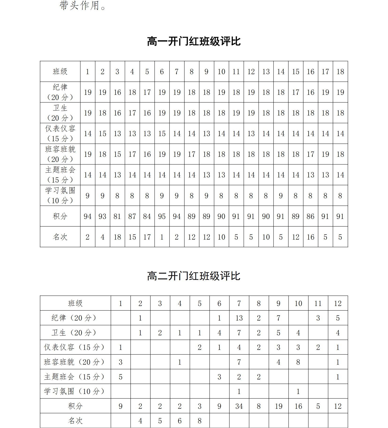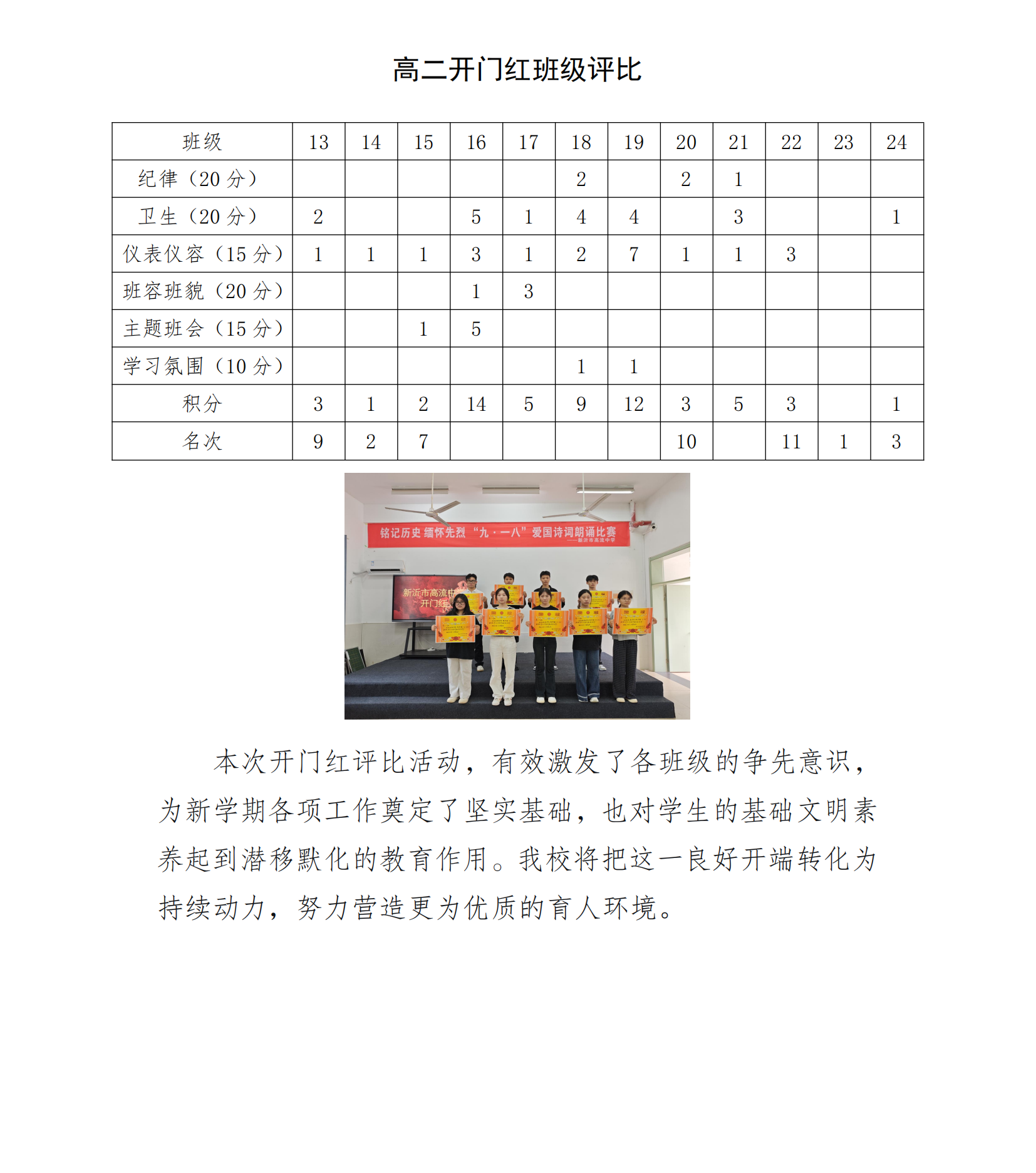 为营造积极向上、勤学争先的开学氛围,9 月 1 日-9 月10 日,学校德育处组织开展高一、高二年级“开门红”班级评比活动。
