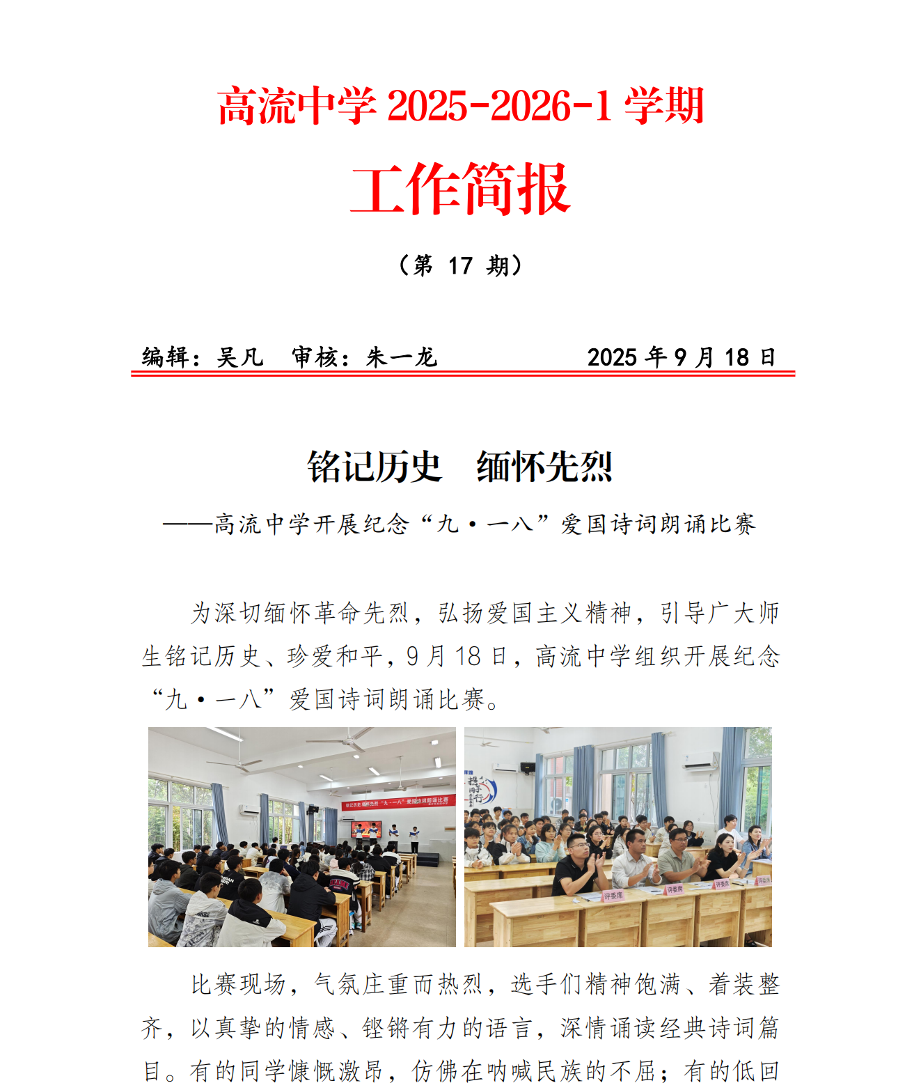 为深切缅怀革命先烈,弘扬爱国主义精神,引导广大师生铭记历史、珍爱和平,9 月 18 日,高流中学组织开展纪念“九·一八”爱国诗词朗诵比赛。